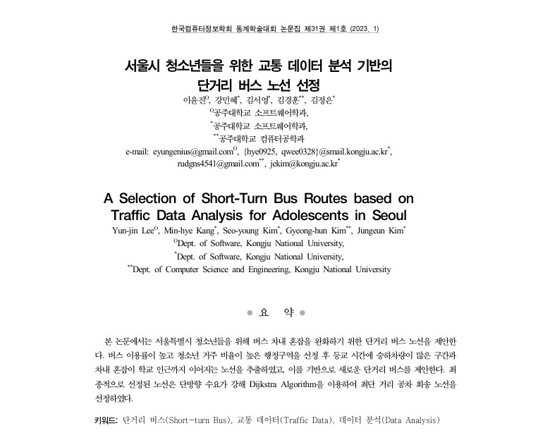 서울시 공공데이터를 분석하고 다익스트라 알고리즘을 활용하여 효율적인 단거리 버스 노선을 제안하는 연구 논문입니다.