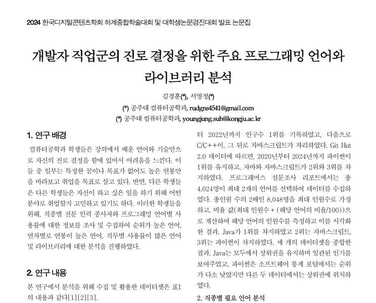 프로그래머스 개발자 설문조사 데이터를 기반으로 언어 사용률, 직무별 기술 스택 및 연봉을 분석하여 동향을 파악한 논문입니다.
