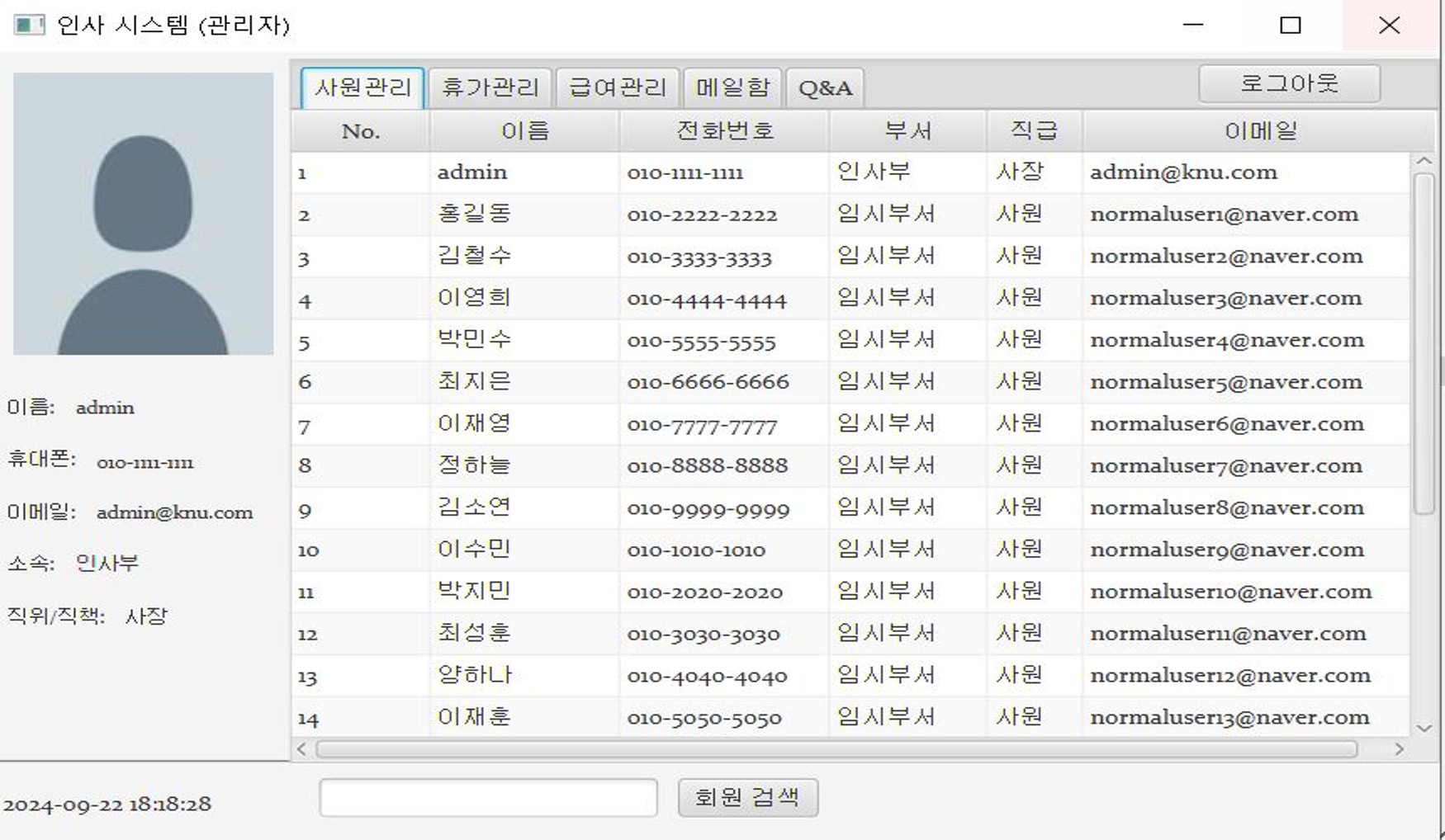 근태관리, 휴가신청, 급여관리, 메일, Q&A 게시판 기능을 제공하는 웹 기반 그룹웨어 시스템